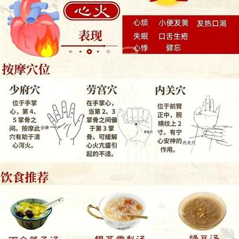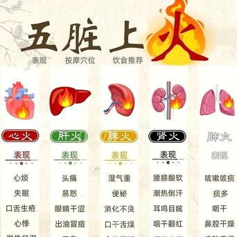 五脏之火! 心火旺:舌尖发红、口腔溃疡、心烦失眠、多梦。 调理方法:可以喝点莲子心茶,吃点苦瓜,按揉少府穴。 肝火旺:眼睛干红、眼屎多、脾气暴躁、容易发怒。 调理方法:保持心情舒畅,多吃点芹菜、苦瓜,按揉太冲穴。 脾火旺:口臭、牙龈肿痛、食欲不振、大便干结。 调理方法:饮食清淡,少吃辛辣油腻,多吃点薏米、山药,按揉商丘穴。 肺火旺:咳嗽、咽喉肿痛、口干舌燥、鼻子出血。 调理方法:多喝水,多吃点梨、百合,按揉鱼际穴。 肾火旺:头晕耳鸣、腰膝酸软、失眠盗汗、五心烦热。 调理方法:可以吃点黑芝麻、黑豆,按揉涌泉穴。 快来自测一下自己是哪个脏器上火了,对症调理,让身体恢复平衡,远离火气! ![]() ![]() ![]() ![]()